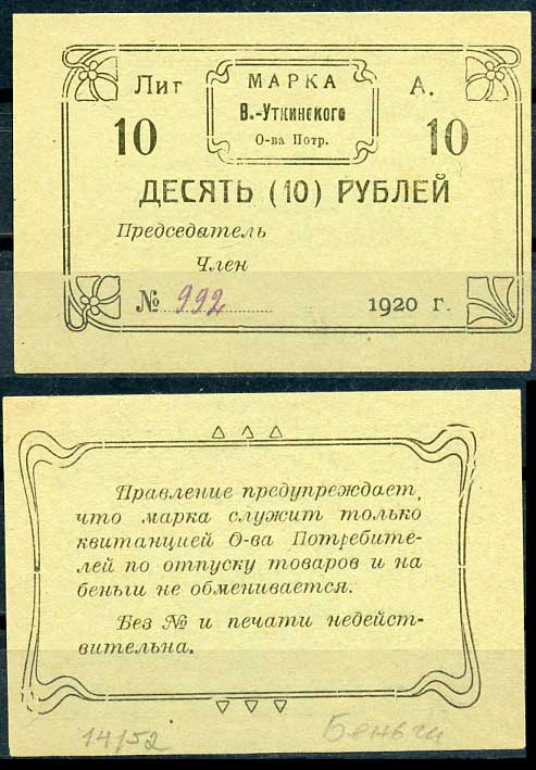 Висимо-Уткинск, Пермская губерния 10 рублей 1920 В.-Уткинское Общество потребителей. Марка. Бланк. Опечатка "беньги" Рябченко нет бумага 437-21-4-1