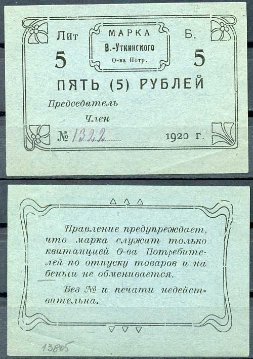 Висимо-Уткинск, Пермская губерния 5 рублей 1920 В.-Уткинское Общество потребителей. Марка. Бланк. Опечатка "беньги" Рябченко 17907р бумага 437-21-2-1