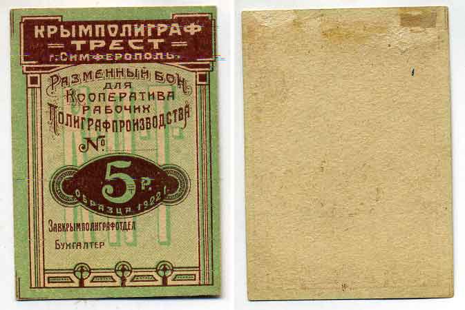 Симферополь 5 Рублей 1922 Крымполиграфтрест. Разменный бон. Бланк Рябченко № 5739р бумага 436-20-1-1