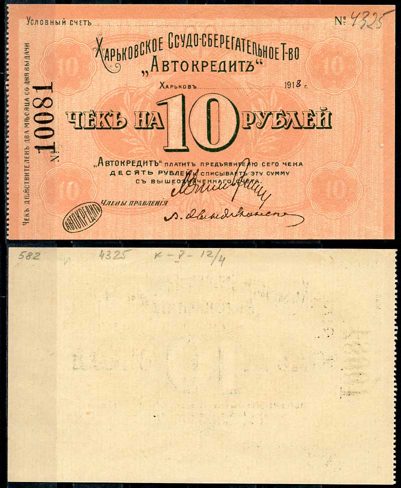 Харьков, Ссудо-сберегательное товарищество "АВТОКРЕДИТ". 10 рублей 1919 Чек. 1919. Бланк Кардаков 5.12.4 бумага 436-54-2-2