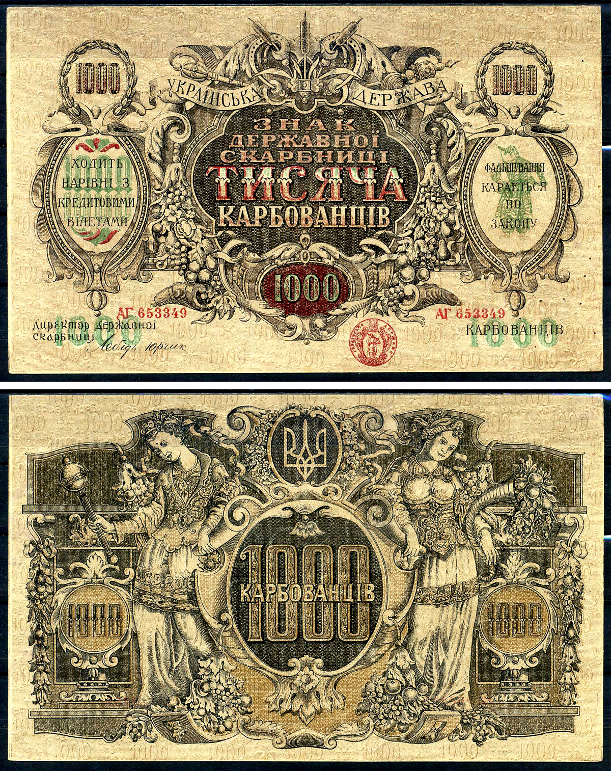 Украина 1000 карбованцев 1919 украинская держава, Знак Державної Скарбниці, серия АГ 653349 Pick 35a, Истомин, 31.1 бумага aUNC 439-77-1-2