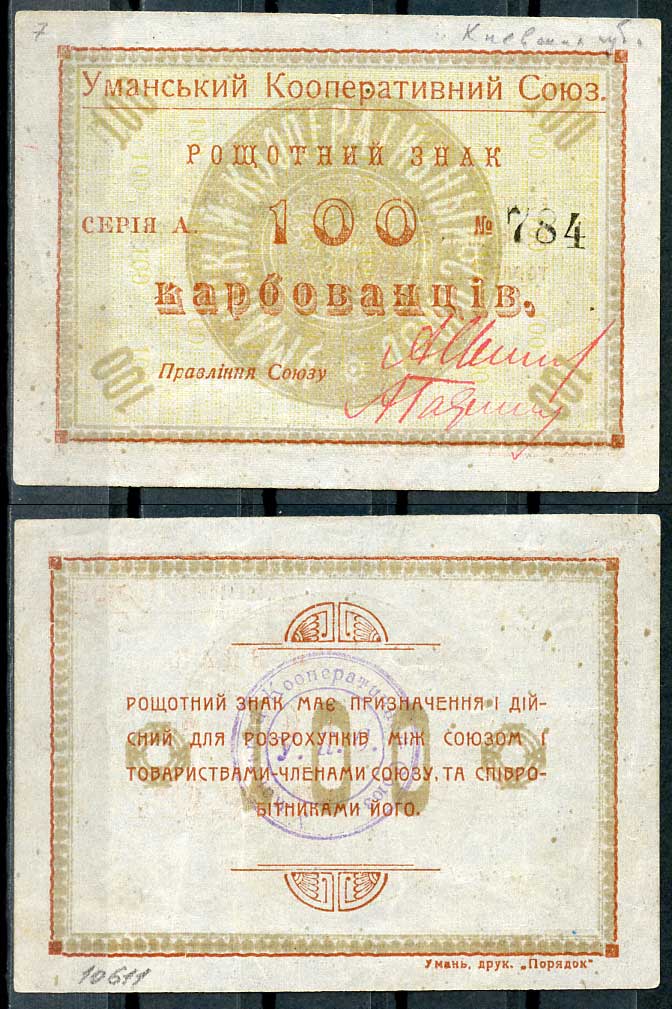Умань, Киевской губернии 100 карбованцев ND Уманський Кооперативний Союз. Рощотний знак. Рябченко 10890 р бумага 436-54-3-1