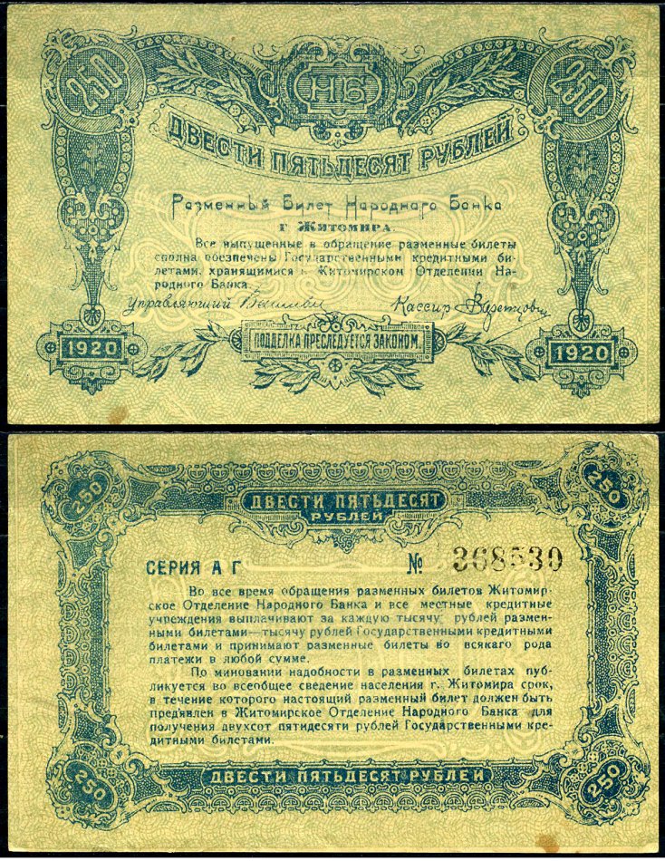 Житомир 250 рублей 1920 разменный билет народного банка г. Житомира Pick S347, Кардаков К5.58.74 бумага aUNC 504-14-2-2