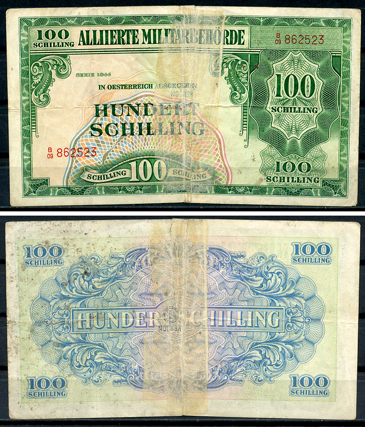 Австрия, Союзные военные власти 100 шиллингов 1944 Allierte Militaerbehoerde Pick 110 a (1), Кардаков 275.3.9 бумага 437-71-2-2