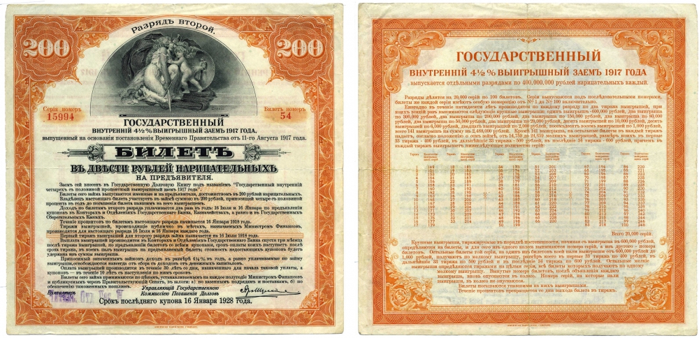 ГОСУДАРСТВЕННЫЙ ВНУТРЕННИЙ 4 1/2 % ВЫИГРЫШНЫЙ ЗАЁМ БИЛЕТ В 200 НАРИЦАТЕЛЬНЫХ РУБЛЕЙ 1917 ВРЕМЕННОЕ ПРАВИТЕЛЬСТВО, ОТ 11 АВГУСТА 1917, №54, СЕРИЯ 15994, РАЗРЯД 2, ПЕЧАТЬ ЧИТИНСКОГО ОТДЕЛЕНИЯ ГОСБАНКА бумага XF 439-49-1