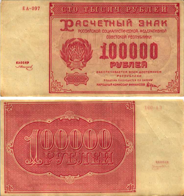 РСФСР 100000 рублей 1921 расчетный знак, серия ЕА-097, водяной знак большие звезды, кассир З. Солонин Pick 117a, ZG-II 2.6.31 бумага 6300-28-3-2