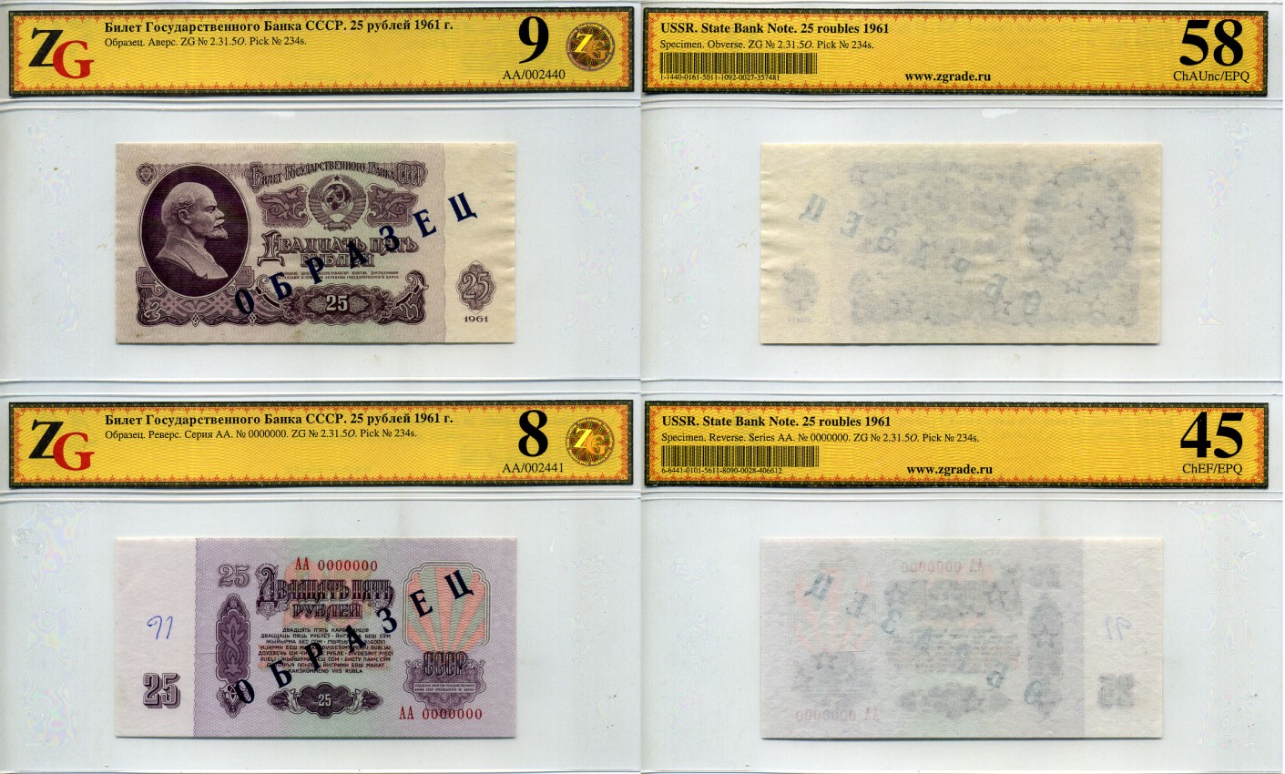 СССР 25 рублей 1961 Государственный казначейский билет СССР, образец, каждая сторона отдельно, серия АА. № 0000000, в холдере компании ZG. Сохранность - 10 ZG № 2.31.5О бумага UNC (пресс) 452-1-72