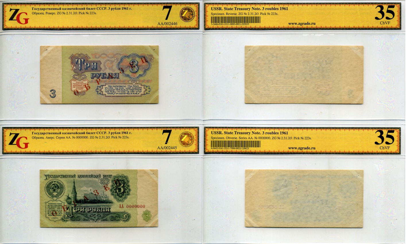 СССР 3 рубля 1961 Государственный казначейский билет СССР, образец, каждая сторона отдельно, серия АА. № 0000000 ZG № 2.31.2О бумага 451-329-1