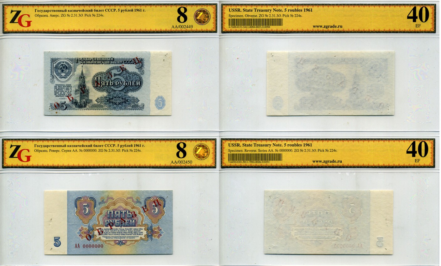 СССР 5 рублей 1961 Государственный казначейский билет СССР, образец, каждая сторона отдельно, серия АА. № 0000000 ZG № 2.31.3О бумага 451-329-2