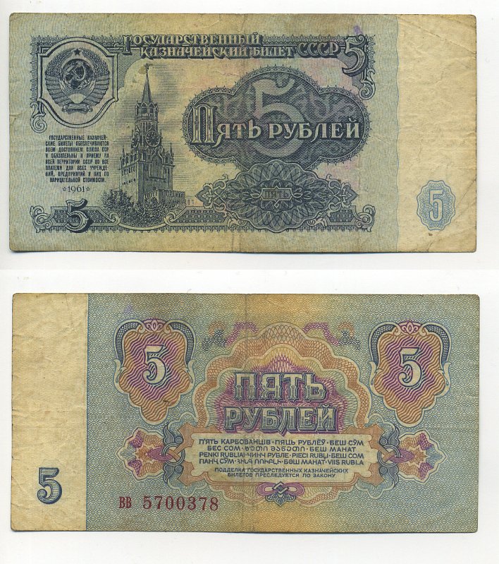 СССР 5 рублей 1961 ШРИФТ НУМЕРАТОРА ПЕРВОГО ТИПА, БУМАГА ВТОРОГО ТИПА Pick 224а, Сергеев 3, Денисов КБ-30.4 бумага 6294-61-4-2