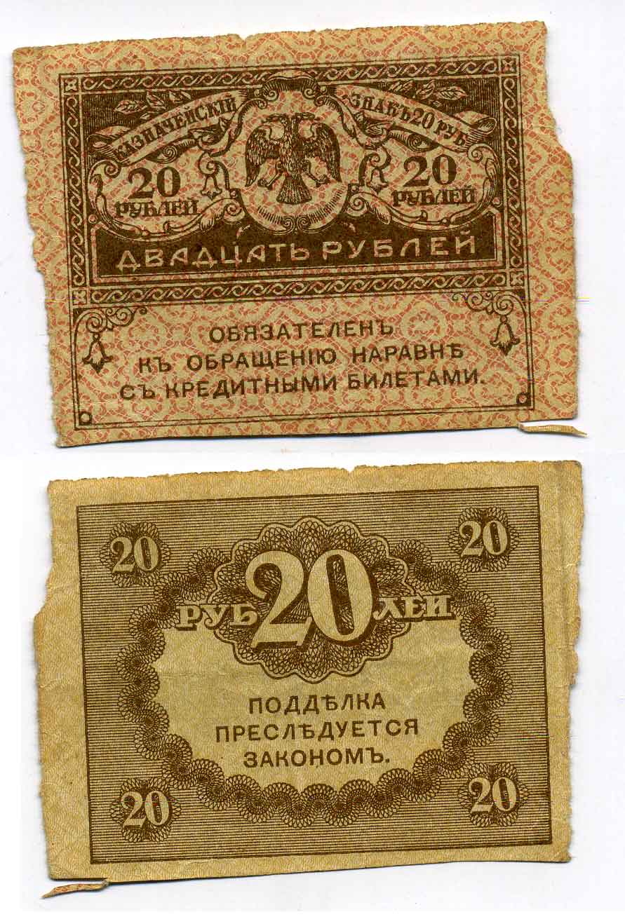 РОССИЯ 20 РУБЛЕЙ 1917 КАЗНАЧЕЙСКИЙ ЗНАК ВРЕМЕННОГО ПРАВИТЕЛЬСТВА, КЕРЕНКА Pick 38, Горянов 1.23.1 бумага 2196-34-1-2