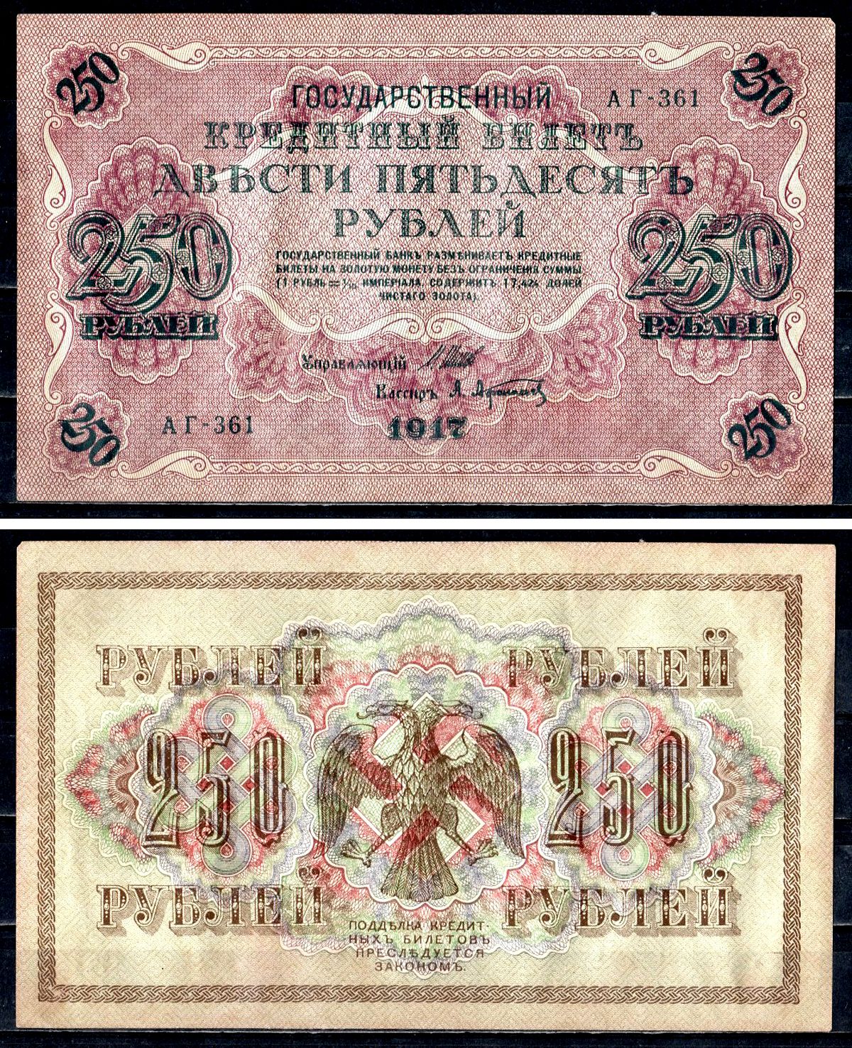 Россия 250 рублей 1917 (1917-1918) выпуск советского правительства (РСФСР), серия АГ-361, управляющий И.П. Шипов, кассир А.Афанасьев Pick 36 (2-1), Горянов 1.12.2 бумага aUNC 504-45-2-2