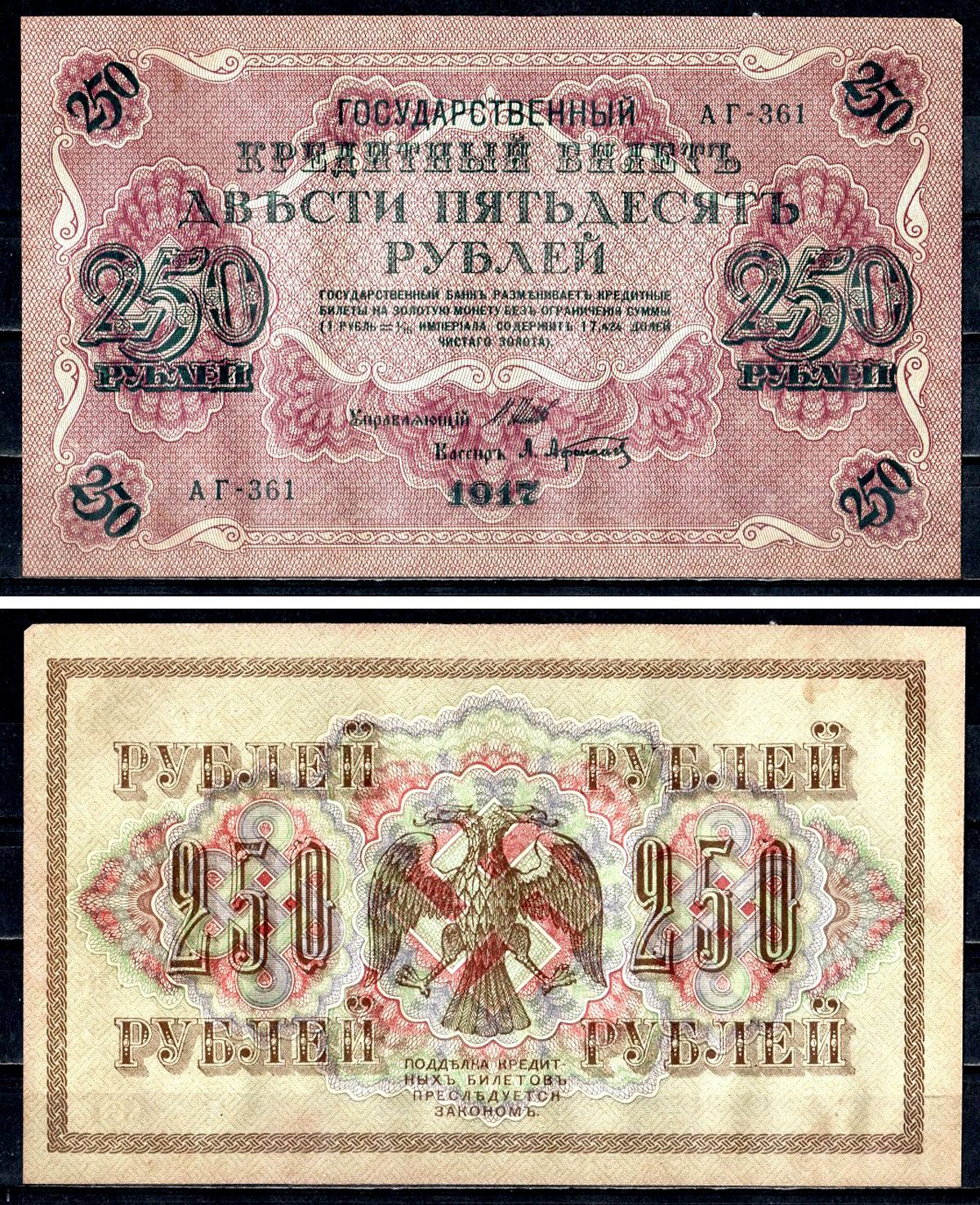 Россия 250 рублей 1917 (1917-1918) выпуск советского правительства (РСФСР), серия АГ-361, управляющий И.П. Шипов, кассир А.Афанасьев Pick 36 (2-1), Горянов 1.12.2 бумага aUNC 8617-1-1-2