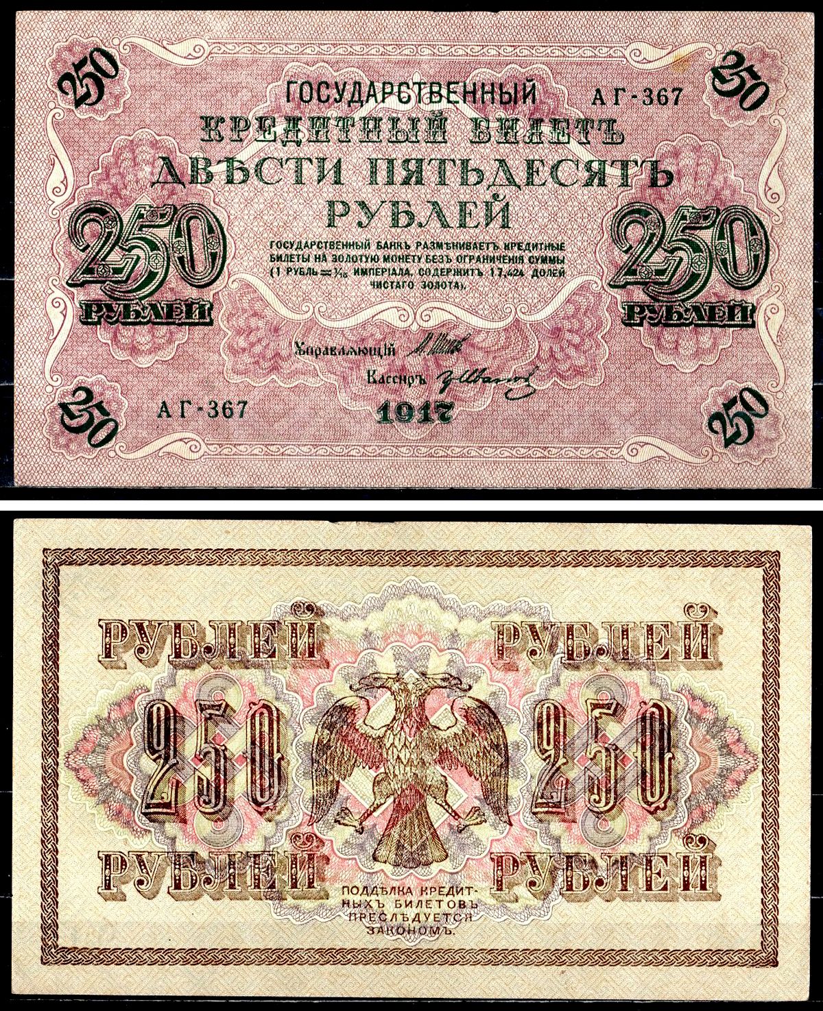 Россия 250 рублей 1917 (1917-1918) выпуск советского правительства (РСФСР), серия АГ-367, управляющий И.П. Шипов, кассир Иванов Pick 36 (2-7), Горянов 1.12.2 бумага aUNC 504-43-1-2
