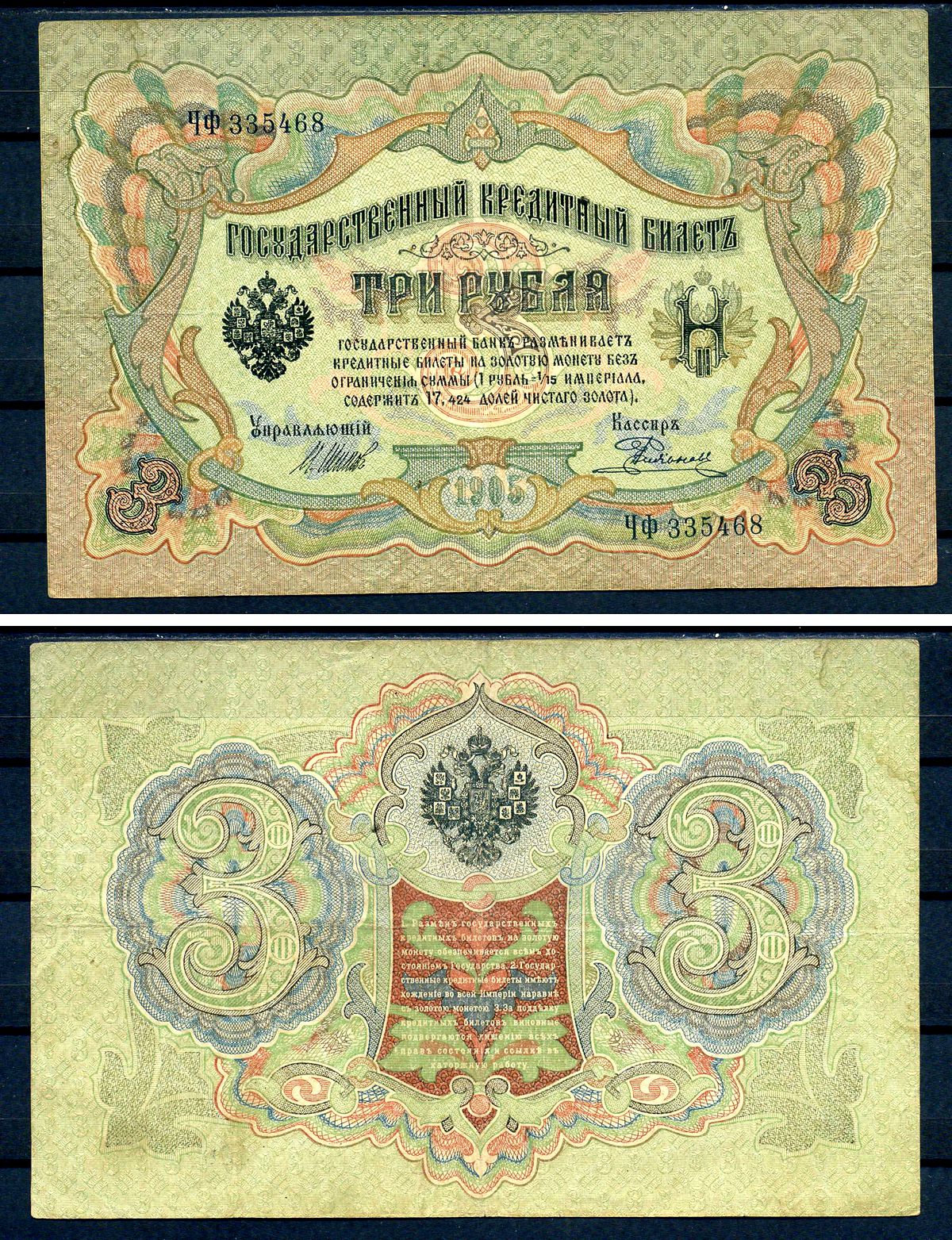 Россия 3 рубля 1905 (1914-1917) выпуск Российской империи, серия ЧФ-335468, управляющий И.П. Шипов, кассир Родионов Горянов 1.17.14, Pick 9 c (8) бумага 7486-75-2-2