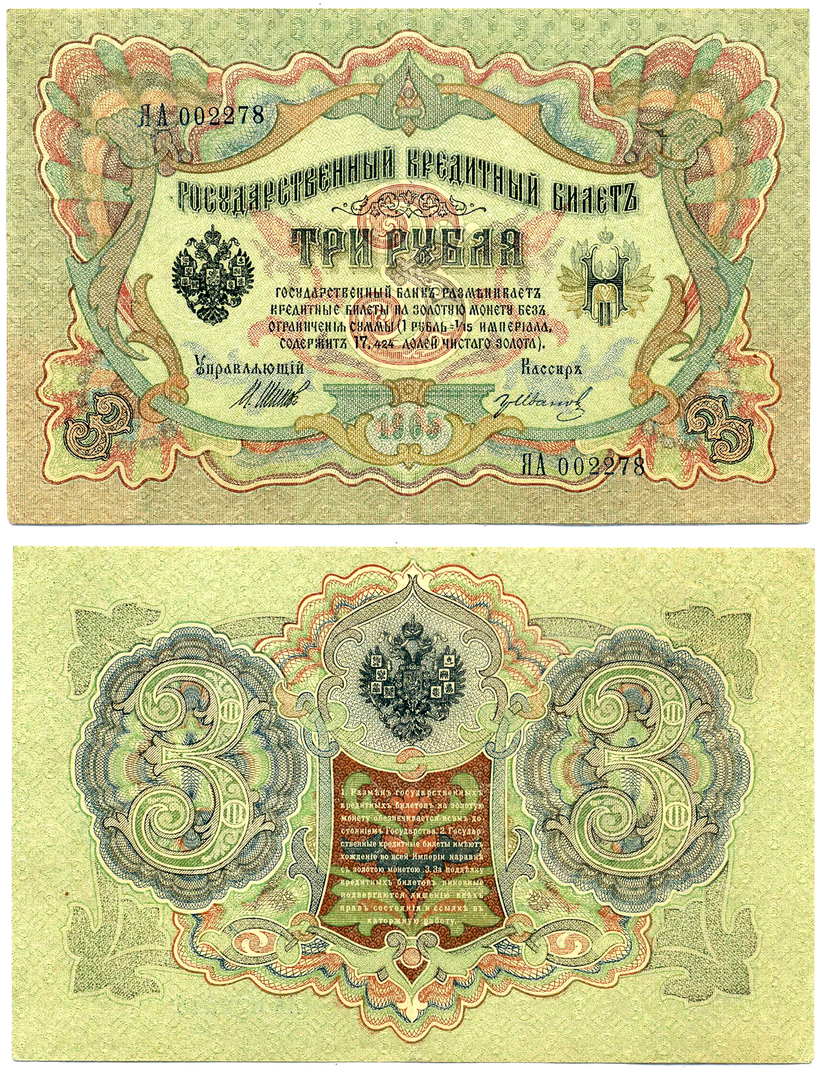 Россия 3 рубля 1905 управляющий ШИПОВ, кассир гр. ИВАНОВ, серия ЯА, ВРЕМЕННОЕ ПРАВИТЕЛЬСТВО (03.1917-10.1917) Pick 9с, Горянов 1.17.15 бумага 8617-21-2-2