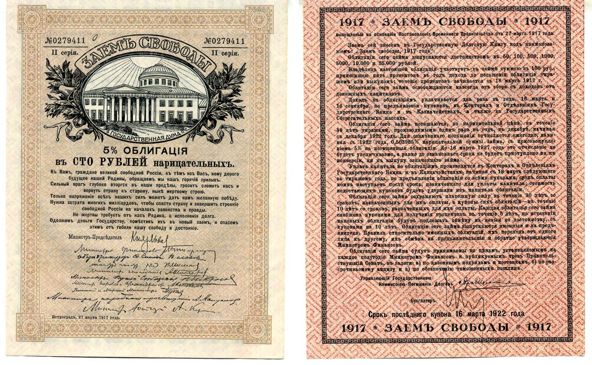 Россия 5 % облигация в 100 рублей 1917 Заем Свободы, II (2-ая) серия, без купонов Pick 37D, Кардаков 12.1а бумага aUNC 504-58-1-2