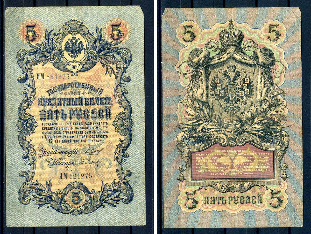 Россия 5 рублей 1909 (1914-1917) выпуск Российской империи, серия ИМ 521275, управляющий И.П. Шипов, кассир Барышев Горянов 1.17.17, Pick 10 b (2) бумага 7485-24-1-1