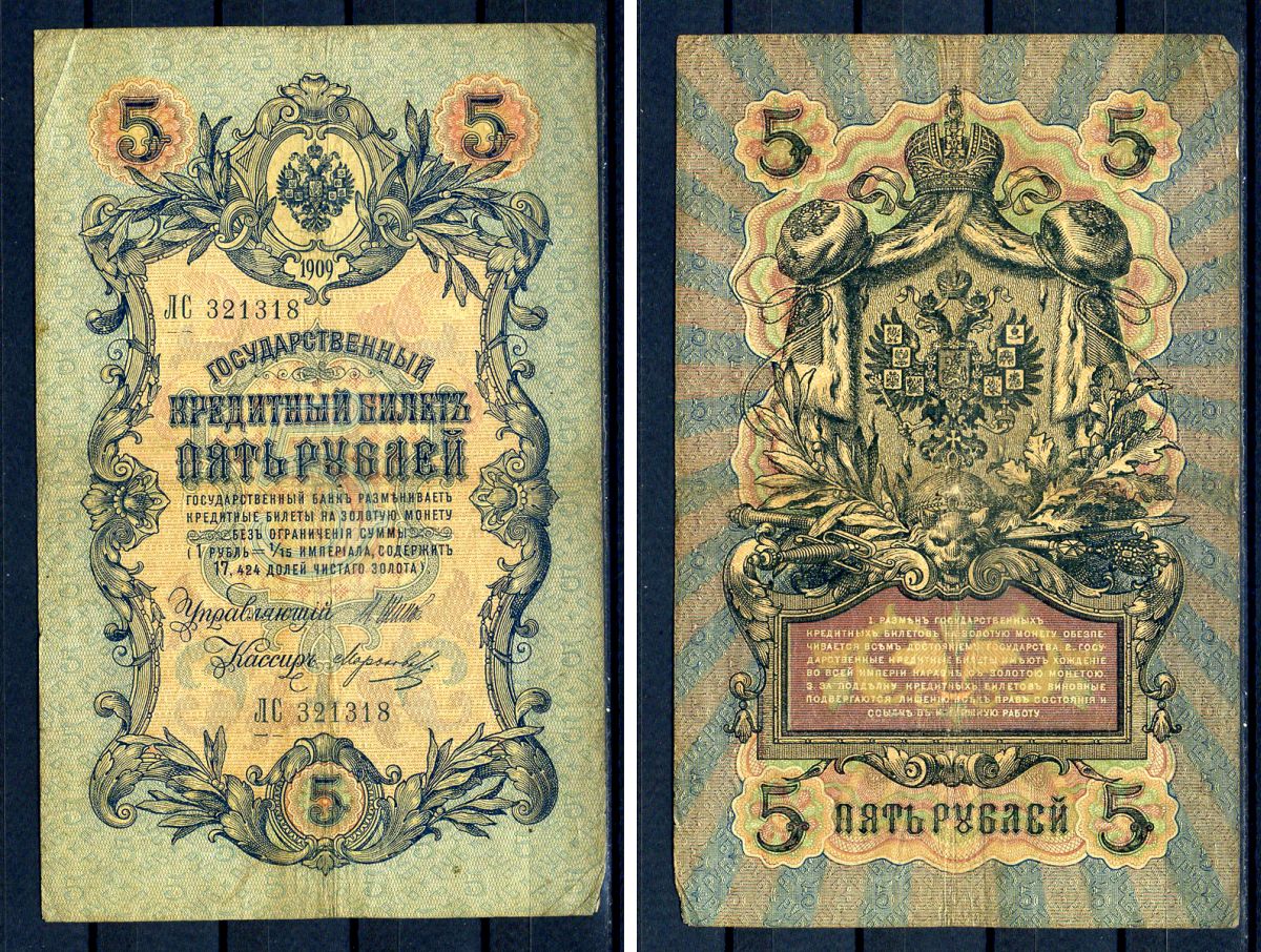 Россия 5 рублей 1909 (1914-1917) выпуск Российской империи, серия ЛС 321318, управляющий И.П. Шипов, кассир Морозов Горянов 1.17.17, Pick 10 b (9) бумага 7485-29-2-1