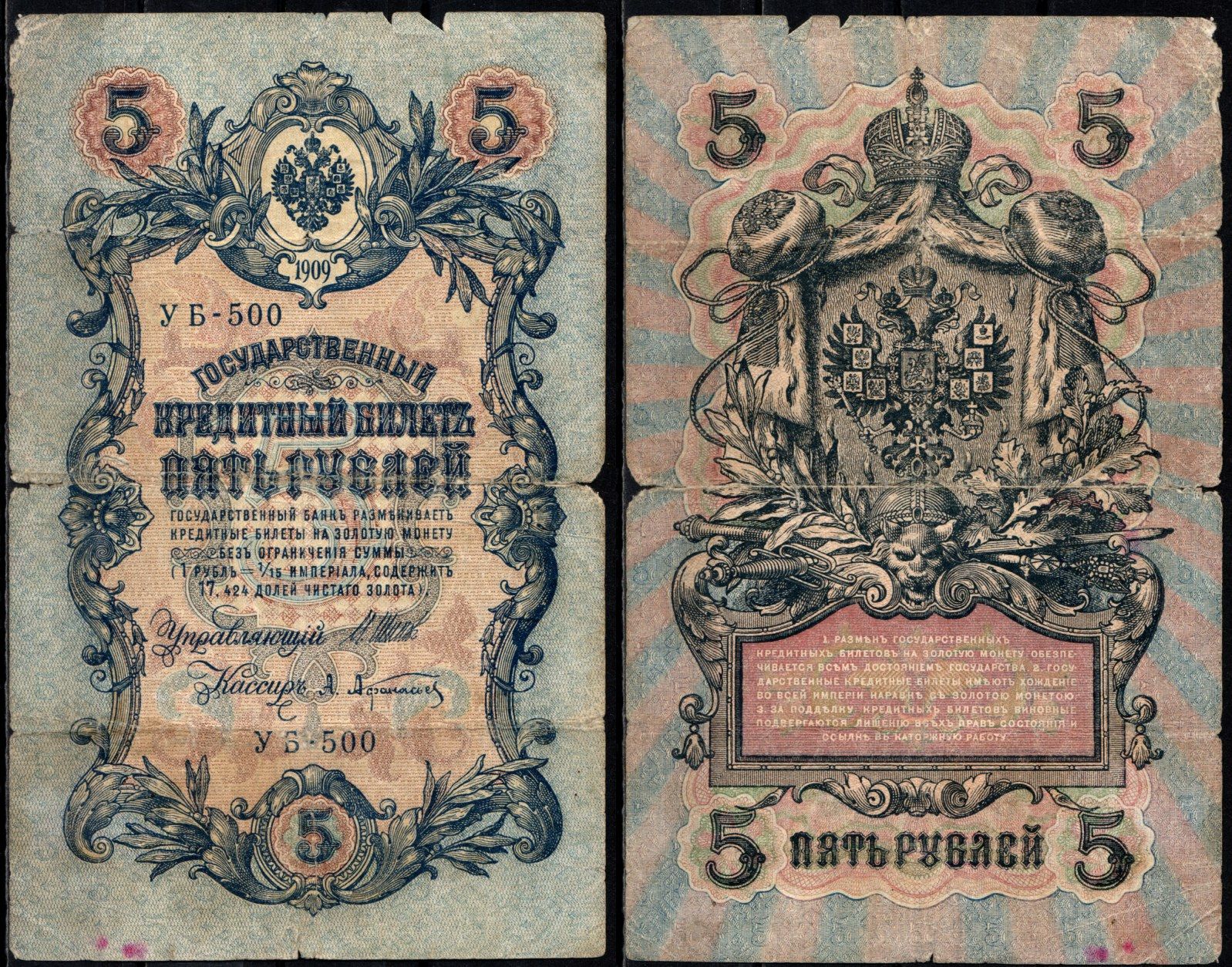 Россия 5 рублей 1909 (1917-1918) подписи: Шипов и Афанасьев Pick 35 a (1-1) бумага 6352-32-3-1