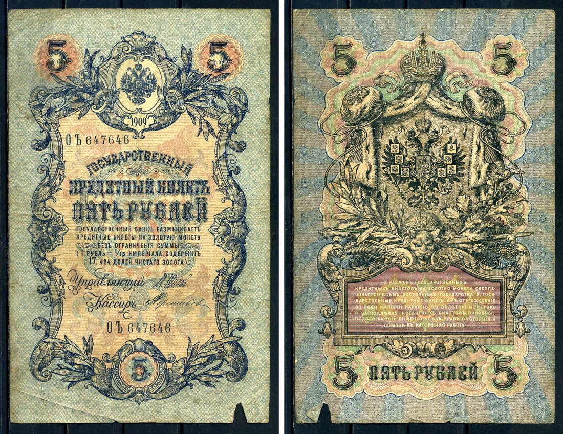 Россия 5 рублей 1909 Государственный кредитный билет управляющий Шипов, кассир Тереньев ОЪ647646 Горянов 1.17.18 бумага 2192-67-2-2