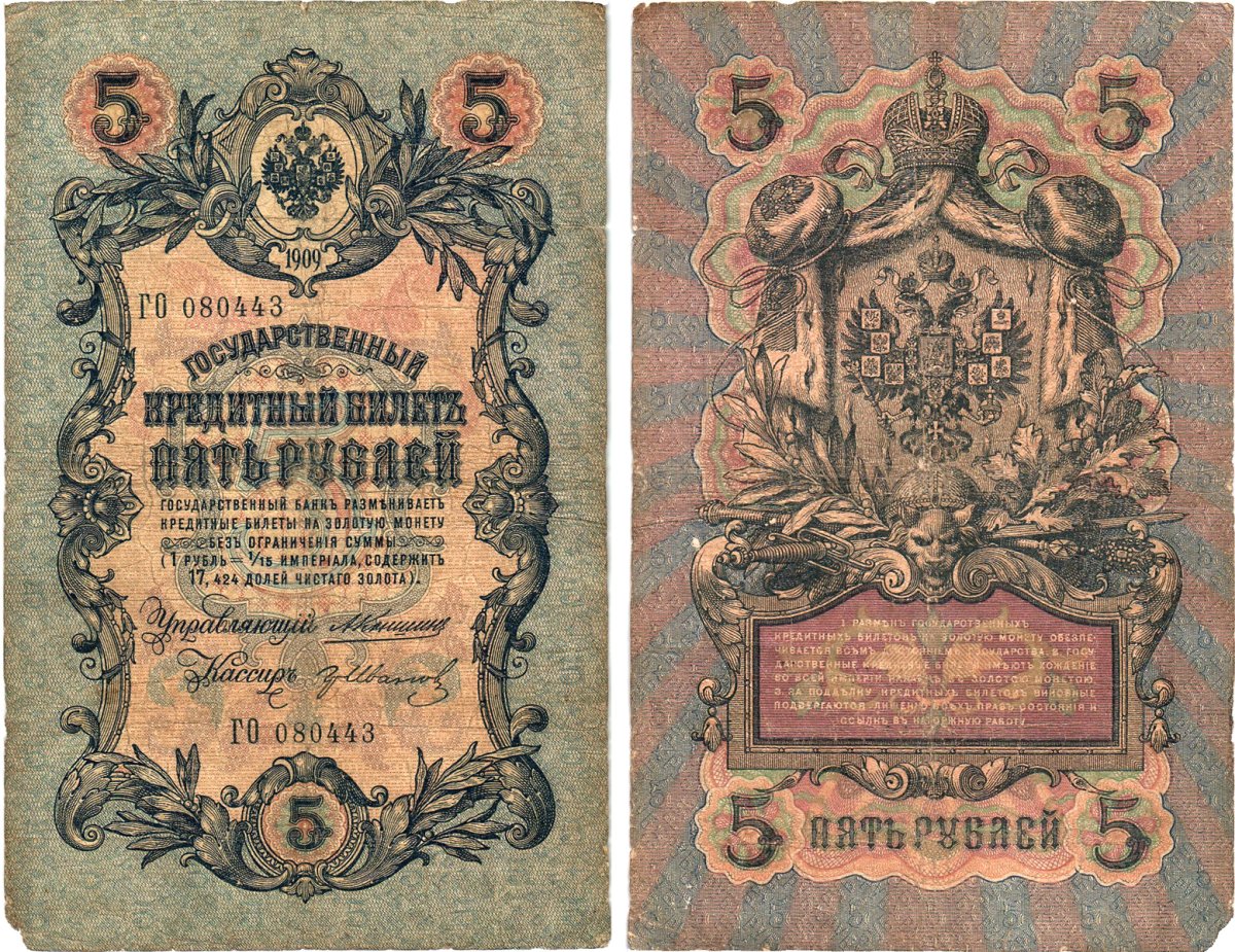 Россия 5 рублей 1909 Управляющий Коншин, кассир Гр. Иванов Горянов 1.16.50 бумага 2197-50-2-2