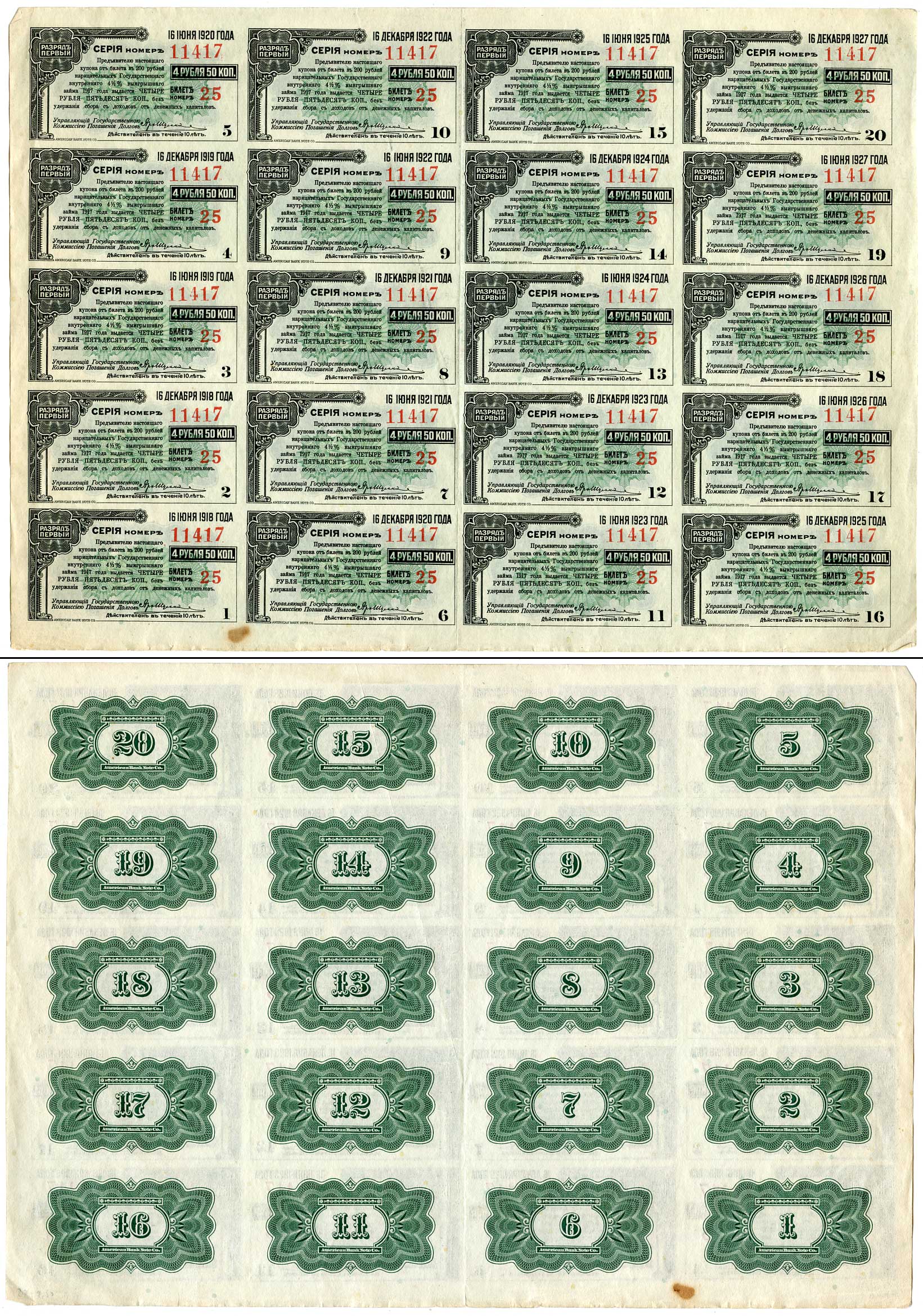 Россия лист из 20 купонов 1917 от билетов 200 рублей Государственного Внутреннего 4 ½ % выигрышного займа 1917 года Кардаков 11.3.45. (2,5 дойчмарки), Рябченко 8556 бумага 505-22-1-2
