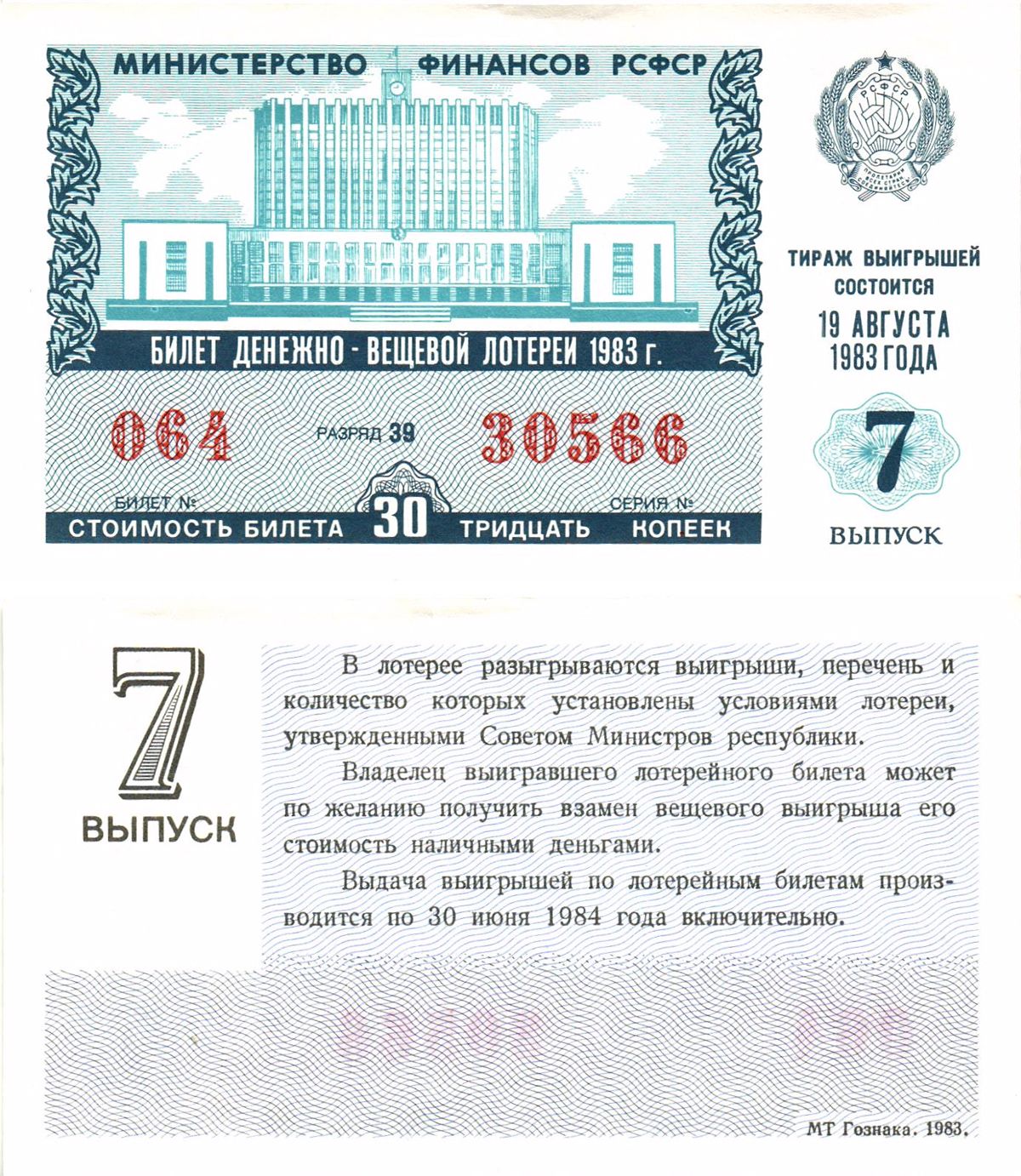 Министерство финансов РСФСР лотерейный билет денежно-вещевой лотерии стоимость 30 копеек 1983 7-й выпуск, разряд 39 бумага UNC (пресс) 8612-60-1-1