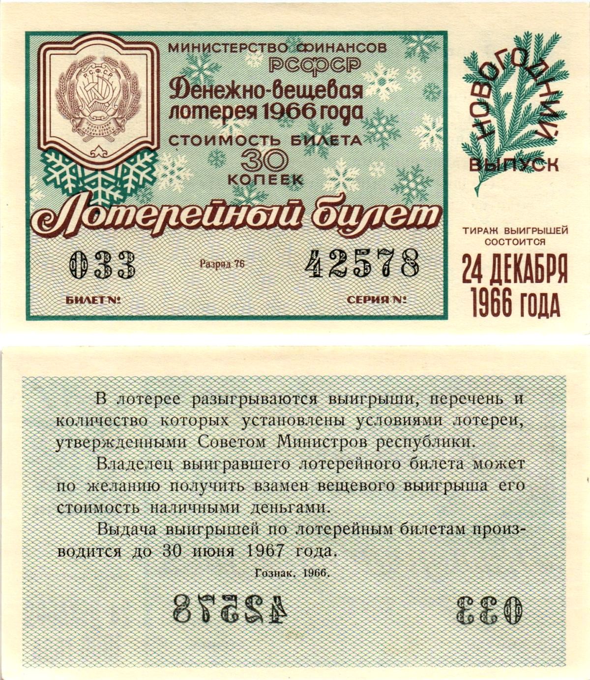 Министерство финансов РСФСР лотерейный билет денежно-вещевой лотерии стоимостью 30 копеек 1966 новогодний выпуск, разряд 76 бумага UNC (пресс) 8607-86-2-1