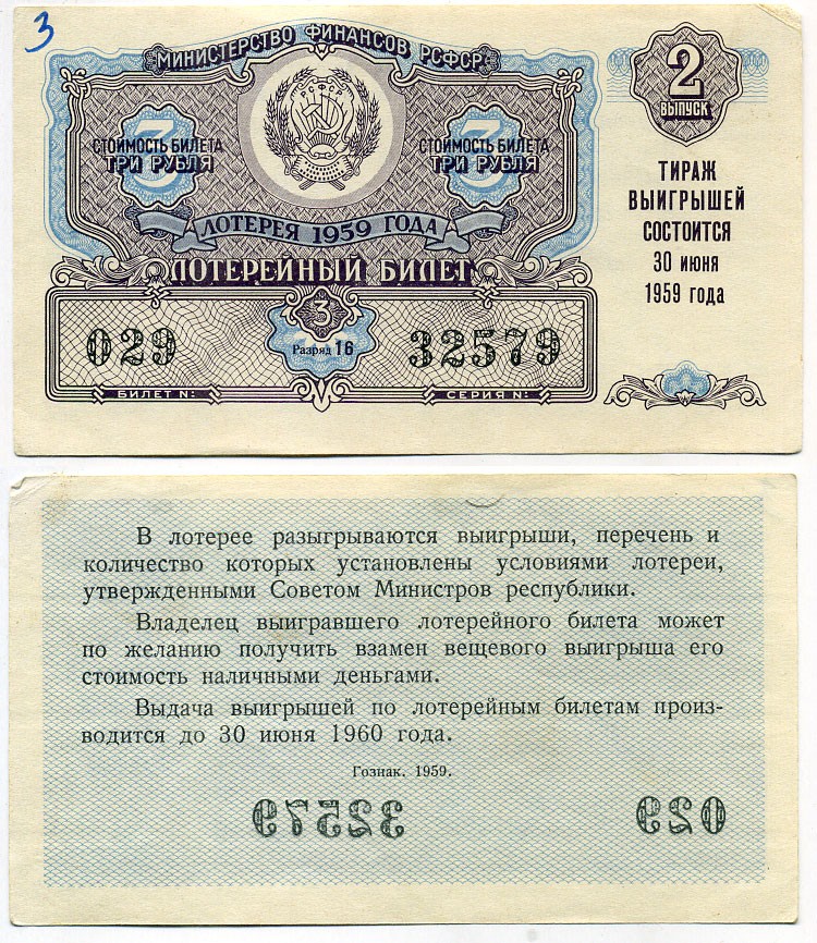 РСФСР 3 рубля 1959 лотерея 1959 года, 2-Й выпуск, 30 ИЮНЯ бумага 8613-40-1-2