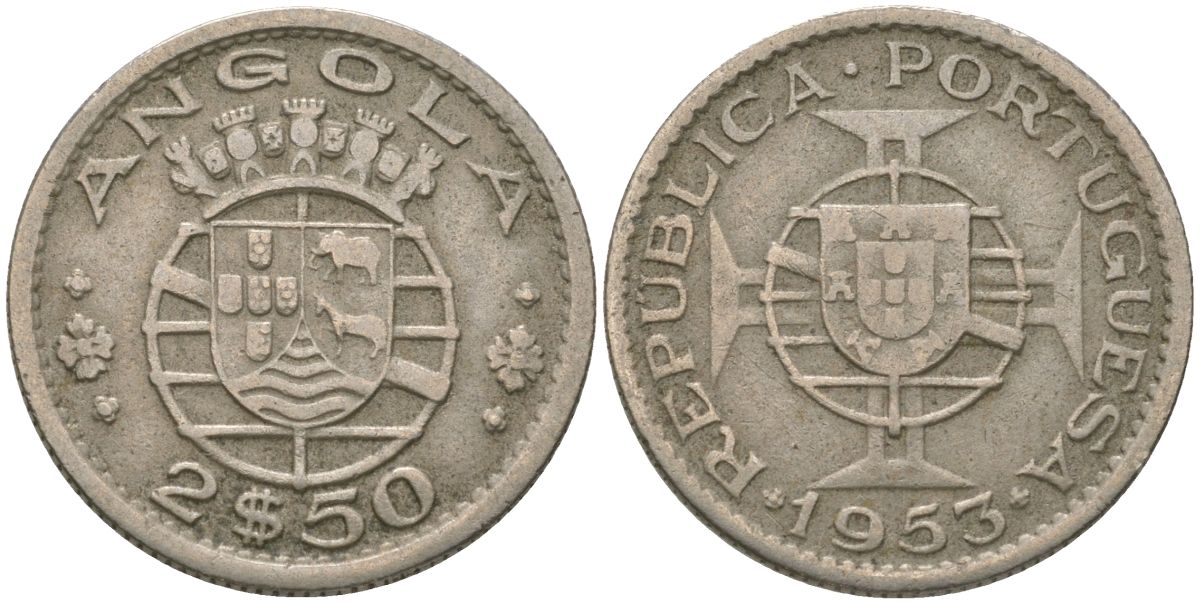 Ангола 2 1/2 эскудо 1953 KM 77 медно-никель 4621-652