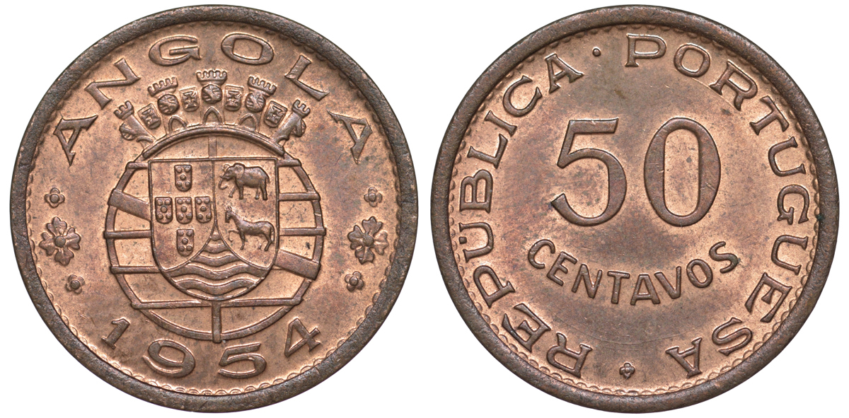 Португальская Ангола 50 сентаво 1954 KM 75 бронза aUNC 4114-511