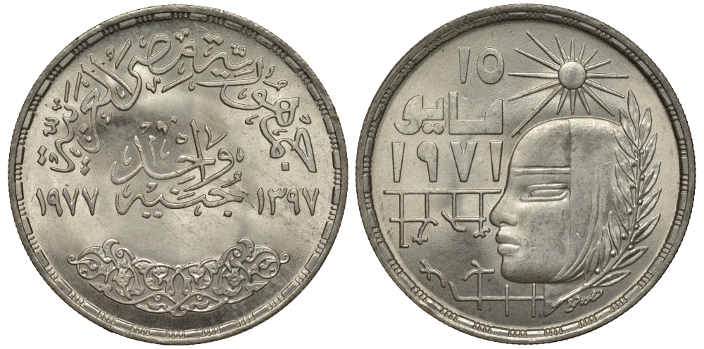Египет 1 фунт 1977 АН1397, корректирующая революция 1971 года, тираж 50000 экз. KM 473 серебро UNC 4044-732