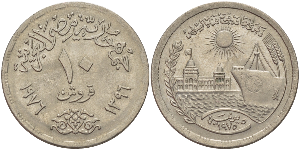 ЕГИПЕТ 10 ПИАСТРОВ 1976 ГОД 1396, ВТОРОЕ ОТКРЫТИЕ СУЭЦКОГО КАНАЛА, КОРАБЛЬ, ЗДАНИЯ KM 452 медно-никель 31-243