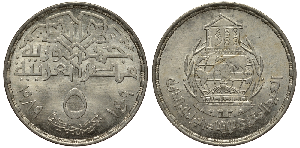 Египет 5 фунтов 1989 АН1409, 100 лет Международному парламентскому союзу KM 665 серебро UNC 4044-1124