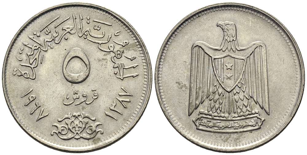 ЕГИПЕТ 5 ПИАСТРОВ 1967 АН 1387, ОБЪЕДИНЁННАЯ АРАБСКАЯ РЕСПУБЛИКА (1958-1971), ОРЁЛ С ЩИТОМ НА ГРУДИ KM 412 медно-никель 4511-213