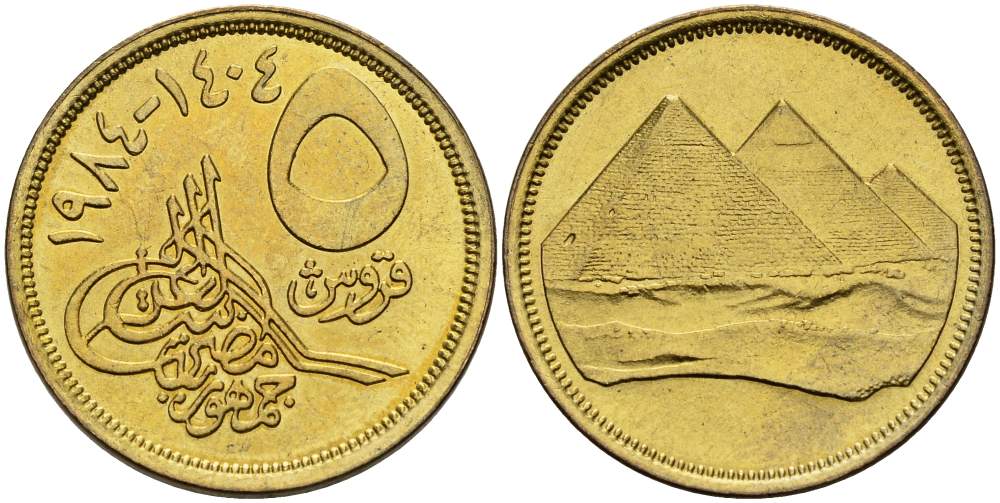 ЕГИПЕТ 5 ПИАСТРОВ 1984 АН1404, ПИРАМИДЫ, ГУРТ ГЛАДКИЙ, НОМИНАЛ НЕ ЗАШТРИХОВАН KM 622.1 алюминиевая бронза 4513-517
