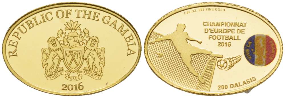 Гамбия 200 даласи 2016 чемпионат Европы по футболу во Франции, овал, эмаль KM NEW золото PROOF 00-809-02