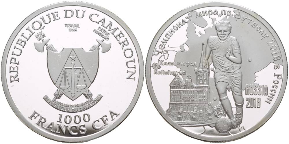 Камерун 1000 франков ND (2018) чемпионат мира по футболу - 2018, Россия, Калининград KM NEW серебро PROOF 1088-2-53