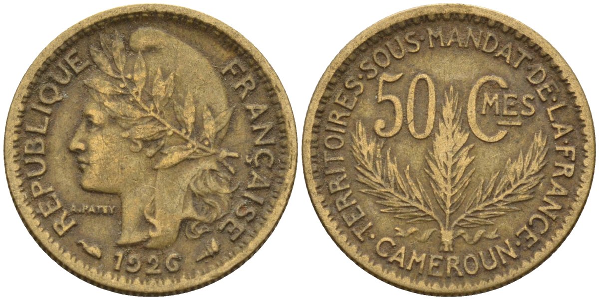 Камерун 50 сантимов 1926 (a), мондвор Париж KM 1 алюминиевая бронза 4169-1124