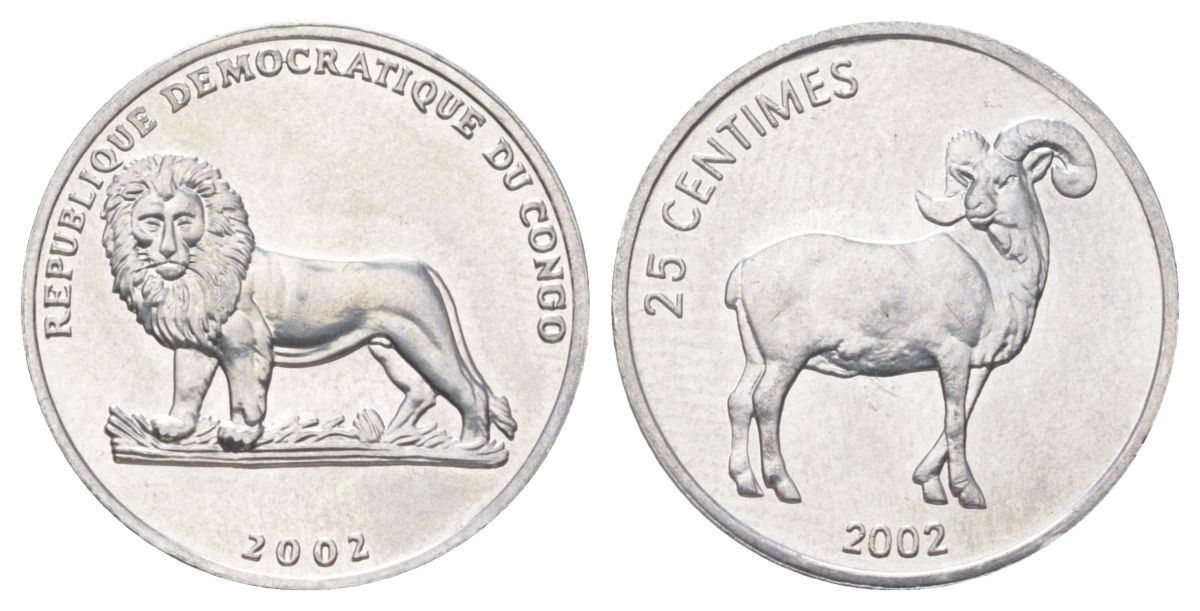 ДР Конго 25 сантимов 2002 Животные - Гривистый баран KM 77 алюминий UNC 4618-544