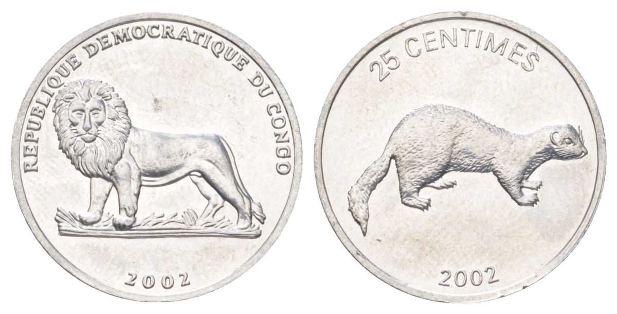 ДР Конго 25 сантимов 2002 Животные - Ласка KM 76 алюминий UNC 4618-543