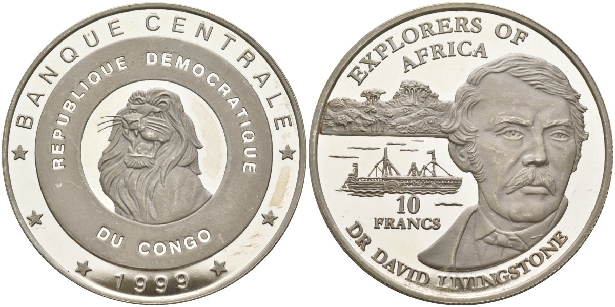 Конго 10 франков 1999 исследователи Африки - доктор Давид Ливингстон, тираж 10000 экз. KM 20 серебро PROOF 04-319-33