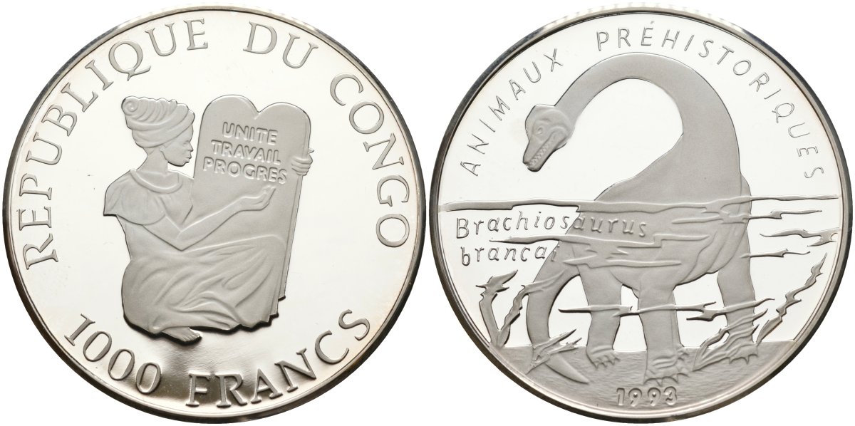 Конго 1000 франков 1993 серия доисторические животные, брахиозавр KM 14 серебро PROOF 04-318-42