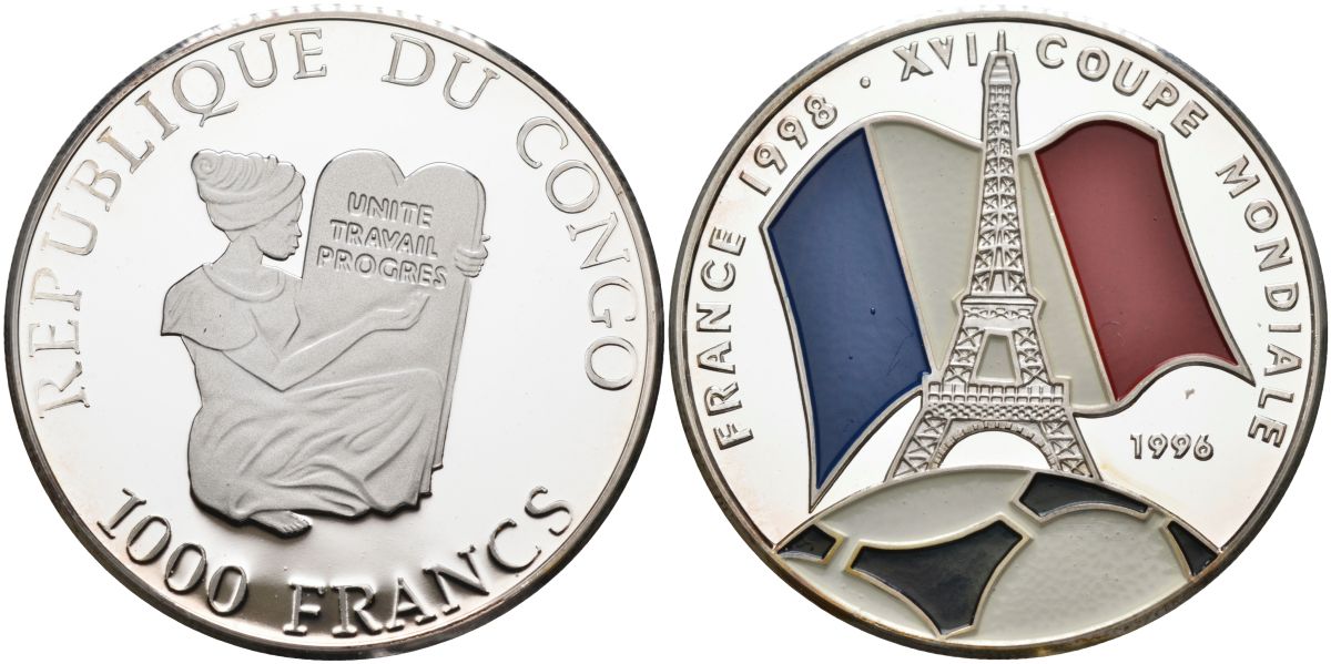 Конго 1000 франков 1996 XVI чемпионат мира по футболу 1998 года во Франции, Эйфелева башня на фоне флага, триколор, цветная эмаль KM 27 серебро PROOF 04-322-24