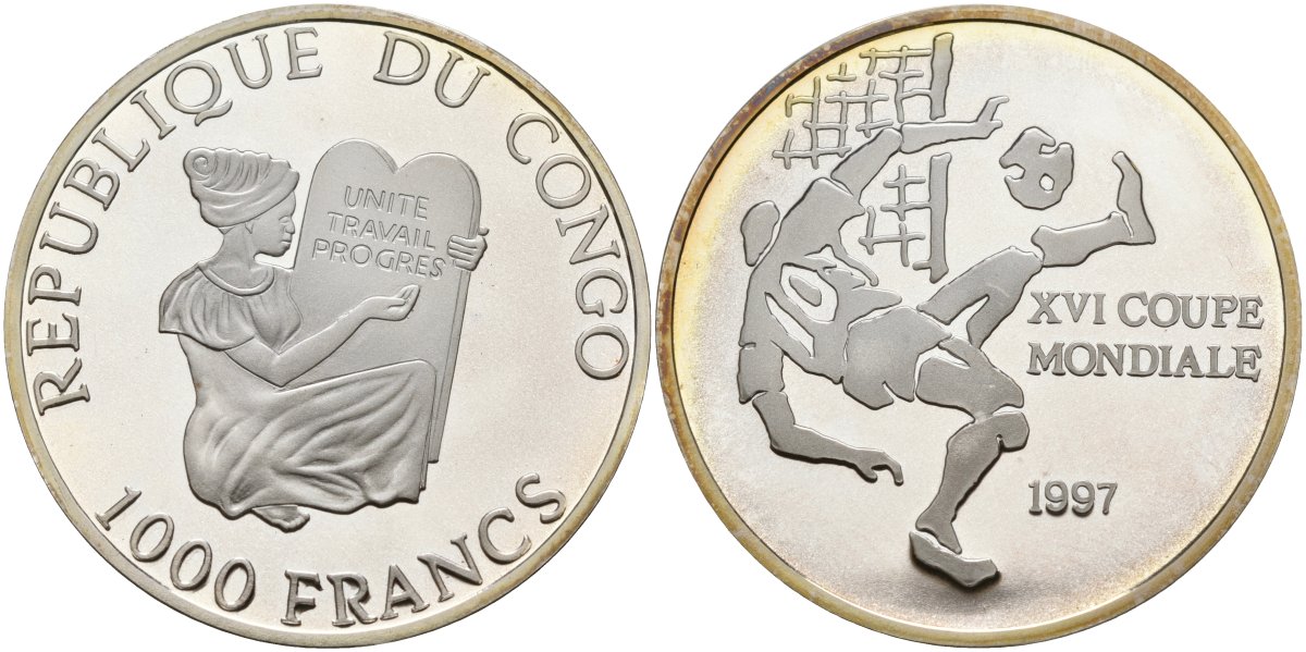 Конго 1000 франков 1997 XVI чемпионат мира по футболу 1998 года во Франции, удар по воротам KM 39 серебро PROOF 04-319-42
