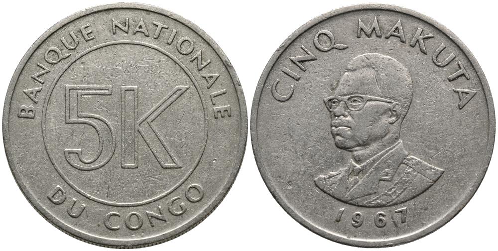 Конго 5 макута 1967 Заир (1967-1970) KM 9 медно-никель 3336-233