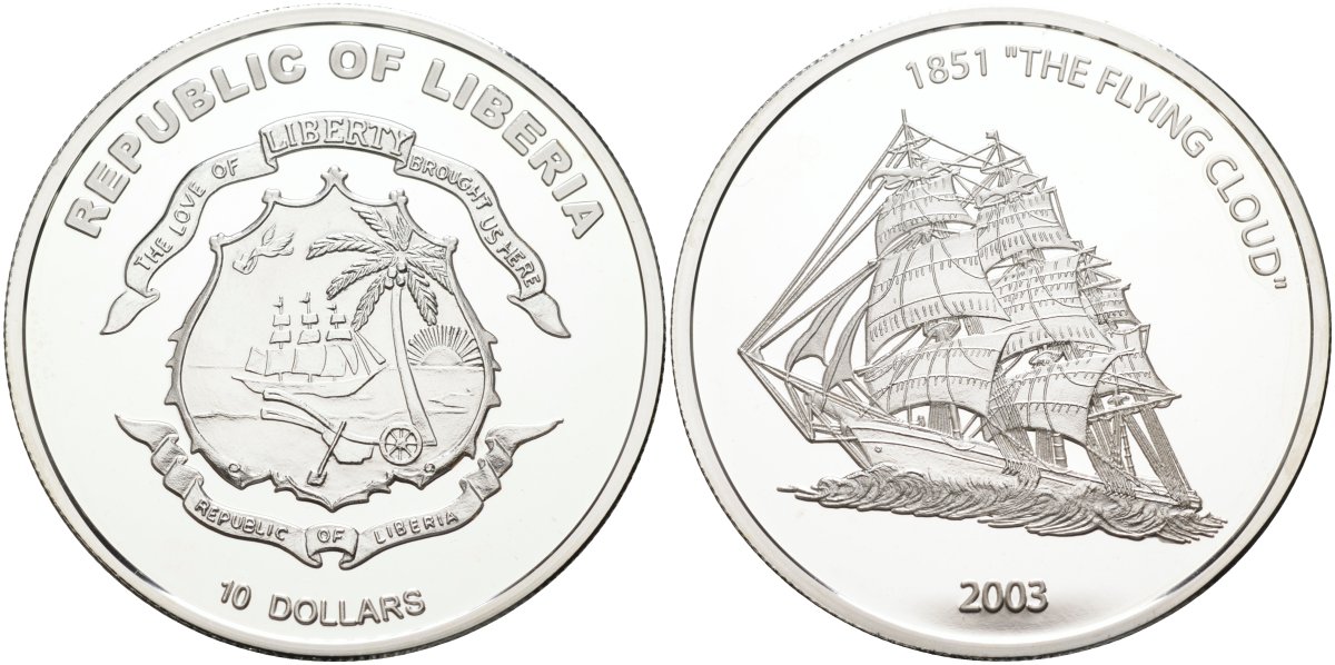 Либерия 10 долларов 2003 парусное судно "The Flying Cloud" 1851 год (летающее облако) KM 708 серебро PROOF 1095-8-61