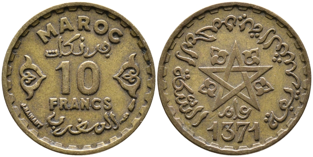 МАРОККО 10 ФРАНКОВ 1951 ГОД 1371, MOHAMMED V (1346-13814) (1927-1962), ФРАНЦУЗСКИЙ ПРОТЕКТОРАТ KM 49 алюминиевая бронза 100-428
