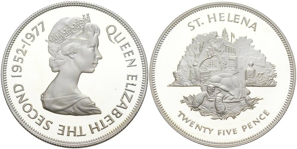Остров Святой Елены 25 пенсов 1977 25 лет правления Елизаветы II (1952-1977), черепаха, тираж 25000 экз. KM 6а серебро PROOF 00-00-00